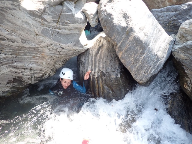 Petite marche d'approche puis des sauts, des toboggans, des passages entre les blocs, des coins secrets et très beaux jusqu'au dernier et très sympa toboggan qui marquera la fin de notre journée de canyoning.